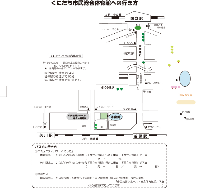 JR国立駅南口バス乗場:4番 立川バス、矢川駅、国立操車場、又は都営いずみ二丁目行き「市民芸術小ホール・総合体育館前」下車